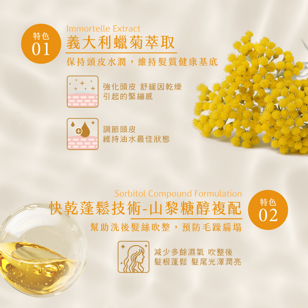 ▲快乾蓬鬆-山梨糖醇複合配方,幫助吹整,預防毛躁扁塌