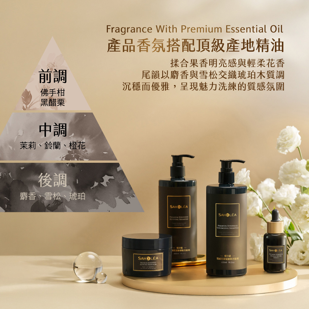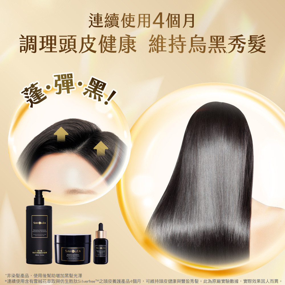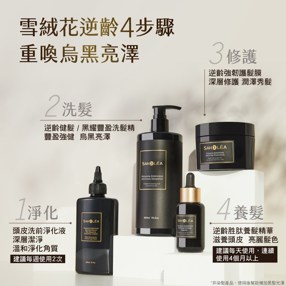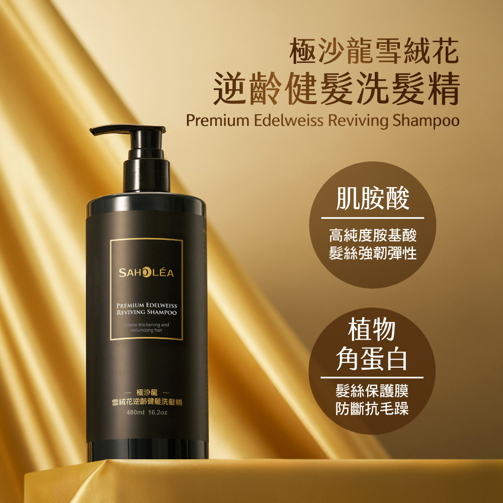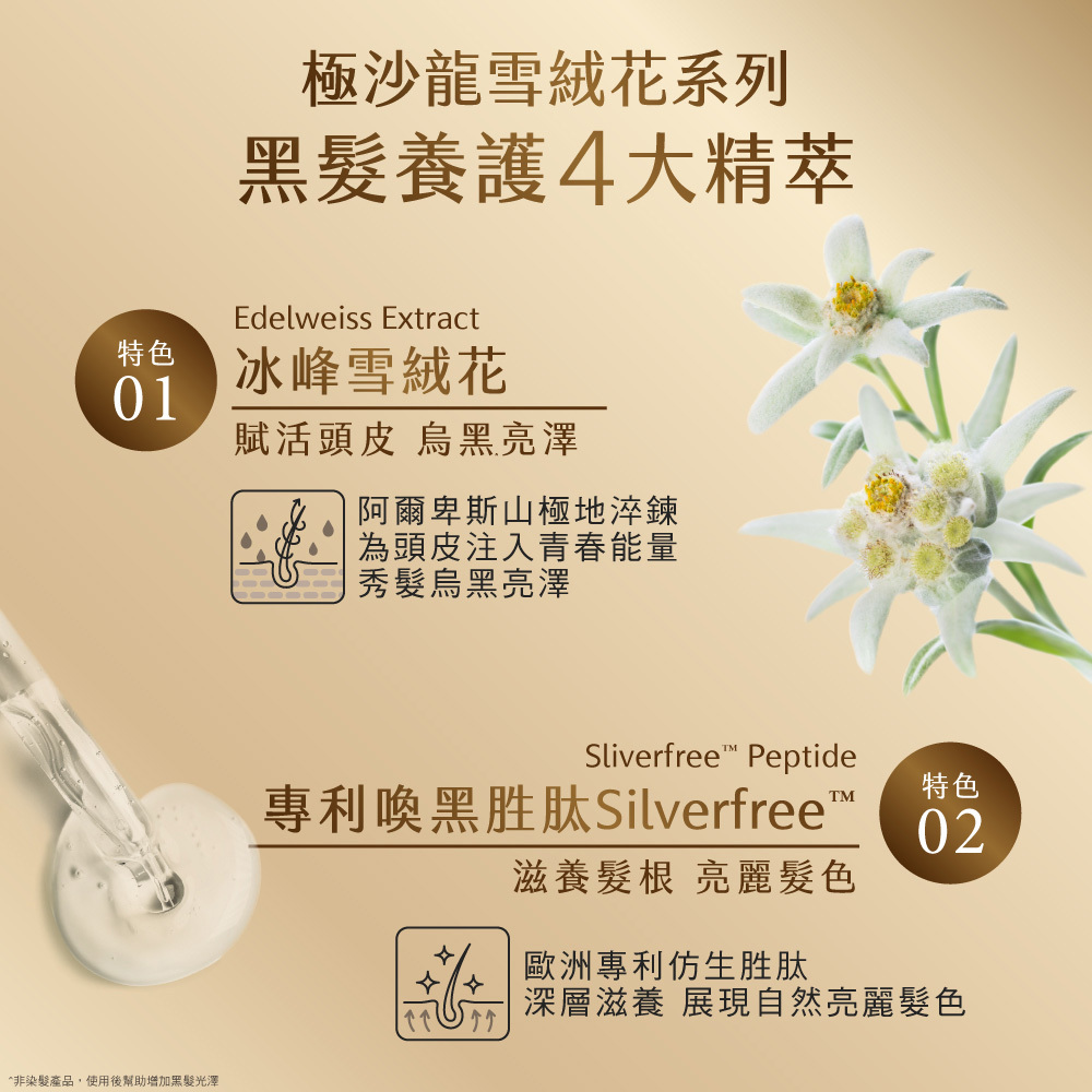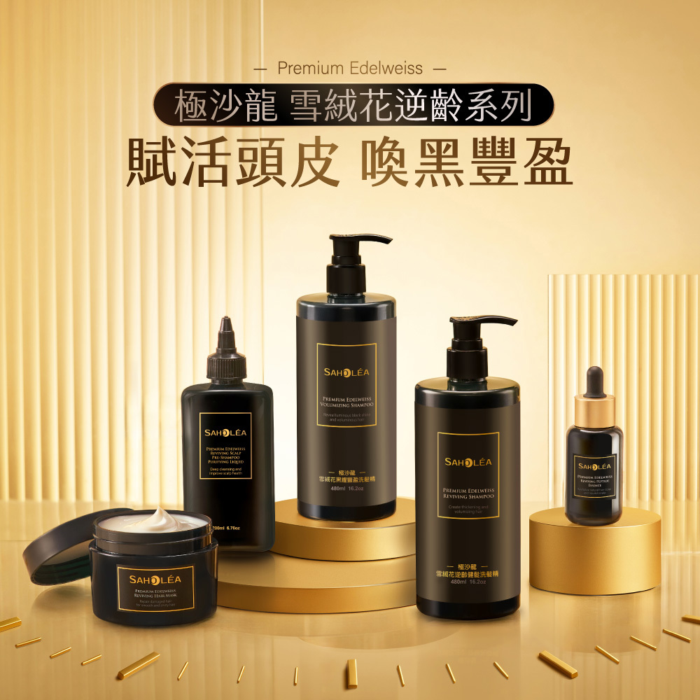 極沙龍雪絨花逆齡系列,冰峰雪融花萃取,賦活頭皮,注入青春能量,展現亮澤秀髮,特別推薦灰白髮者適用