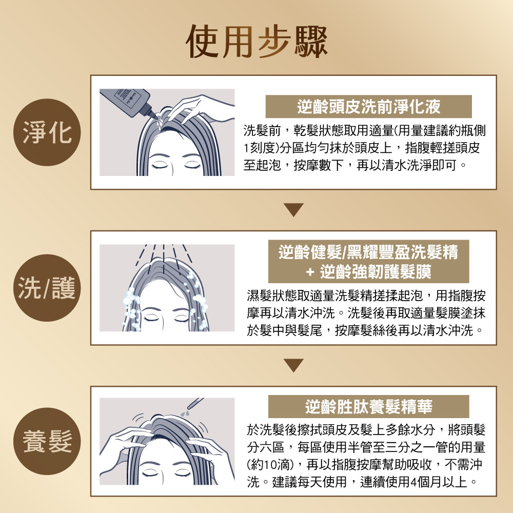 ※此系列淨化液、洗髮精、髮膜、養髮液均非染劑,不具染髮上色效果。建議搭配養髮液一同使用。