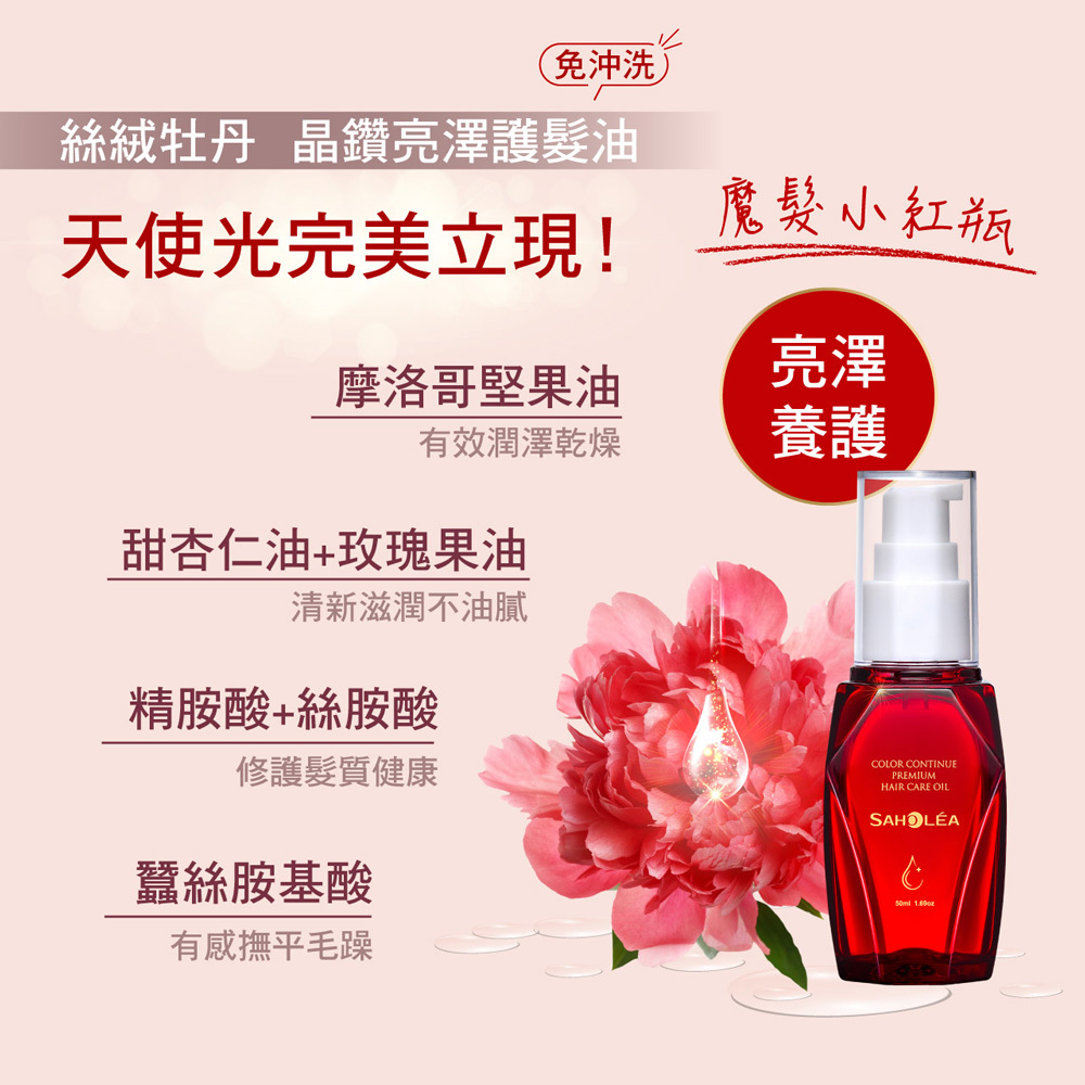 ▲護髮油添加摩洛哥堅果油、甜杏仁油、玫瑰果油