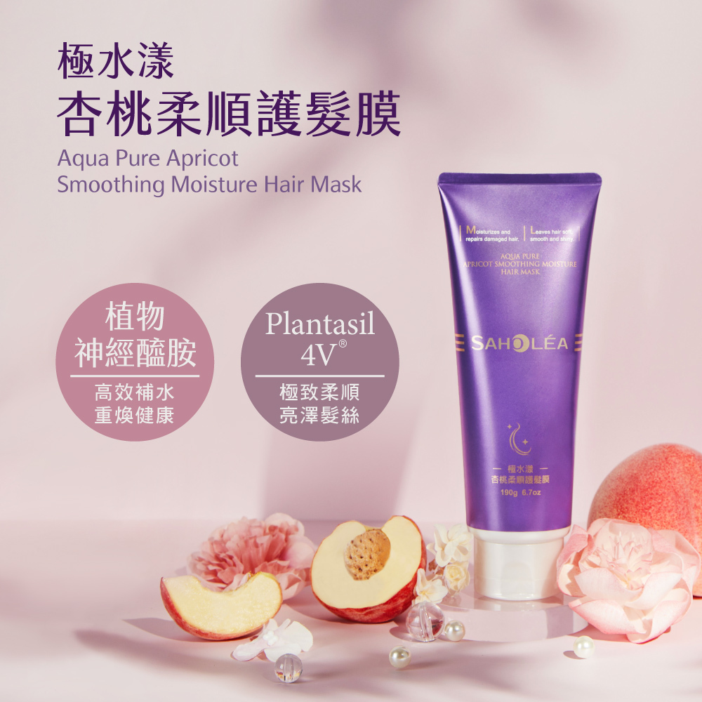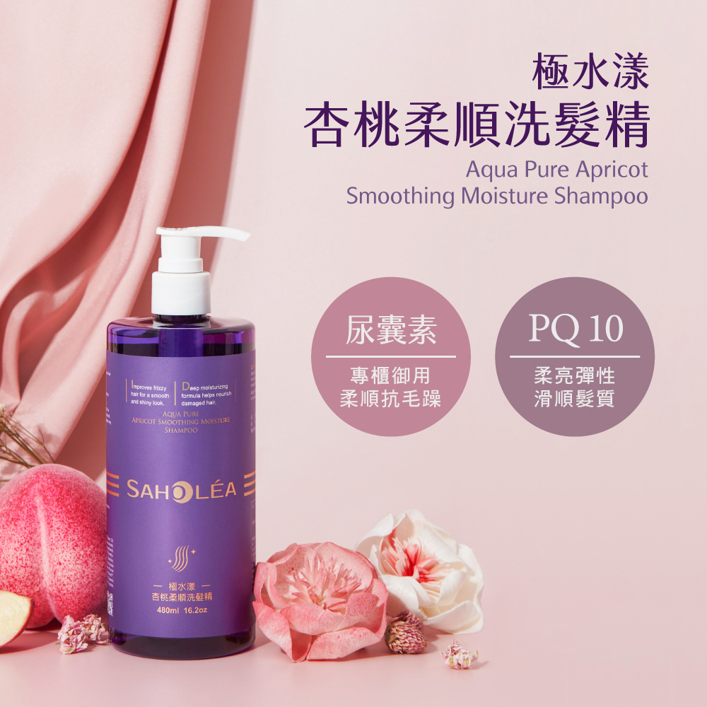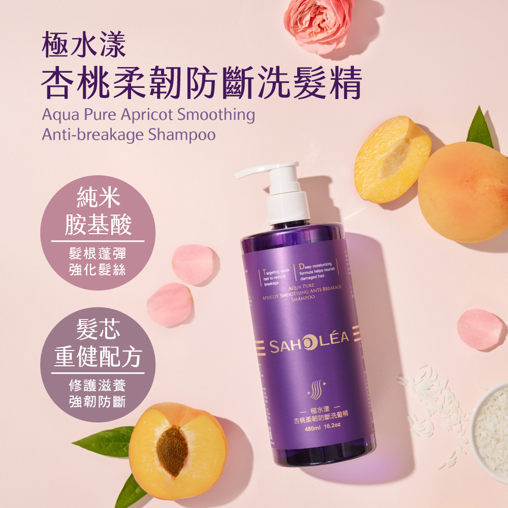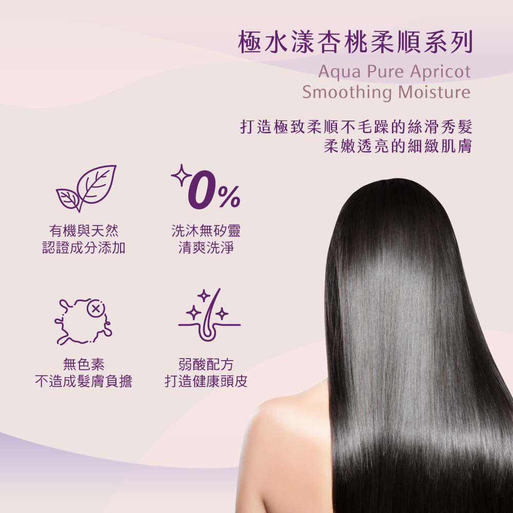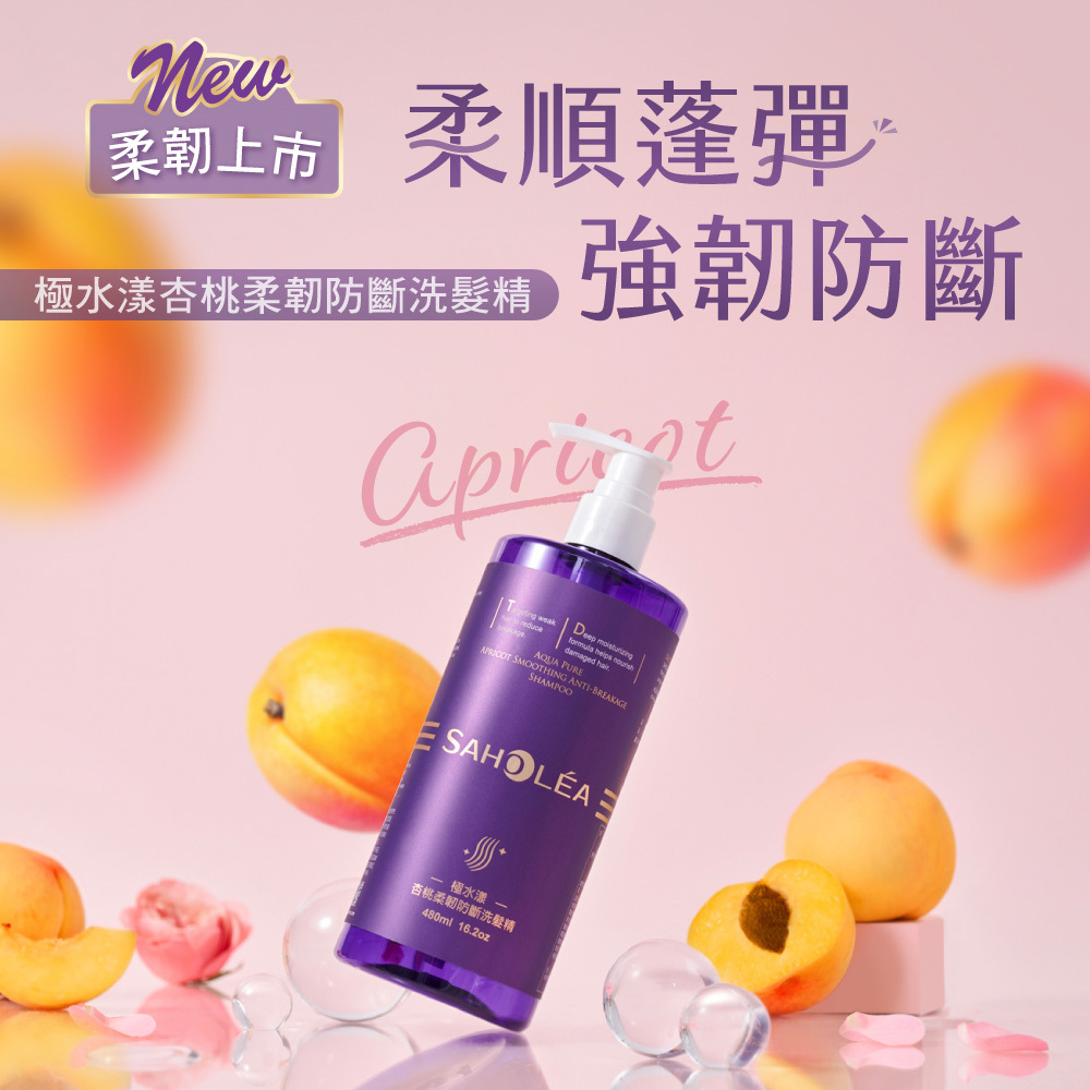 極水漾杏桃柔順系列,選用有機杏桃仁油、專櫃保養成分尿囊素、高濃度胺基酸、微分子玻尿酸,深度調理髮質,創造極致柔亮髮質