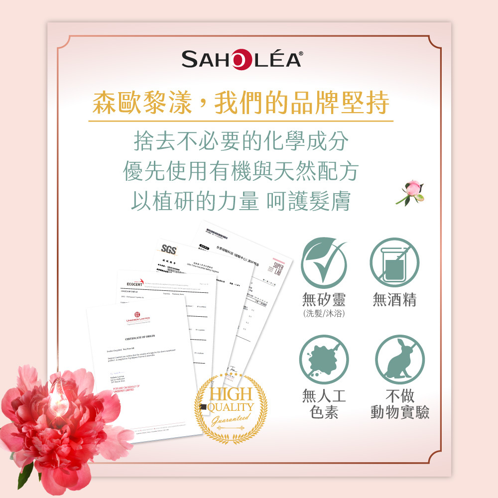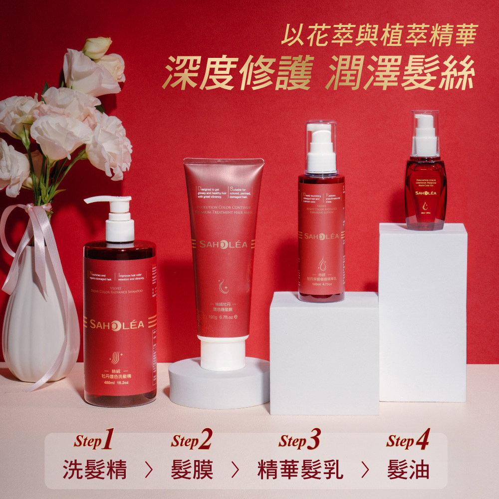 絲絨牡丹護色系列,嚴選牡丹根皮萃取、茉莉紫羅蘭花萃精華、保水成分尿囊素,修護乾燥保濕柔順,維持頭髮光澤顯色度