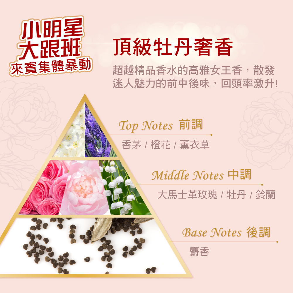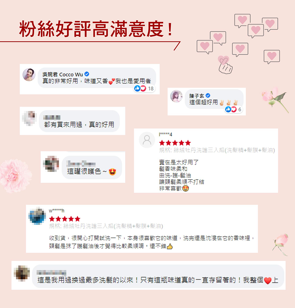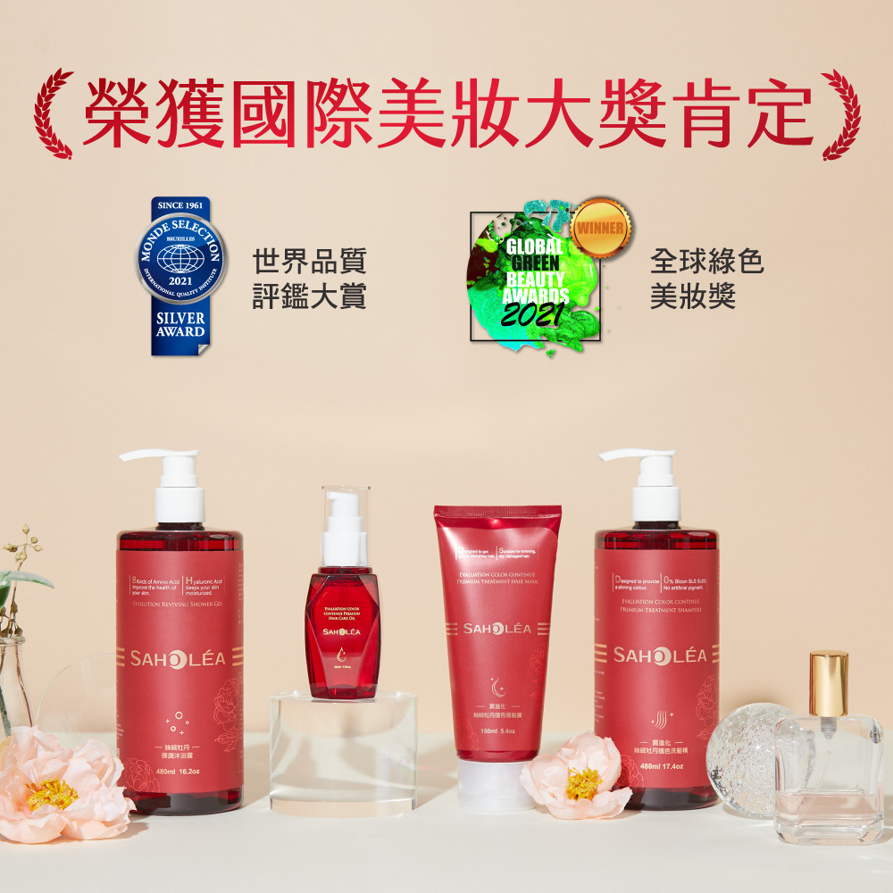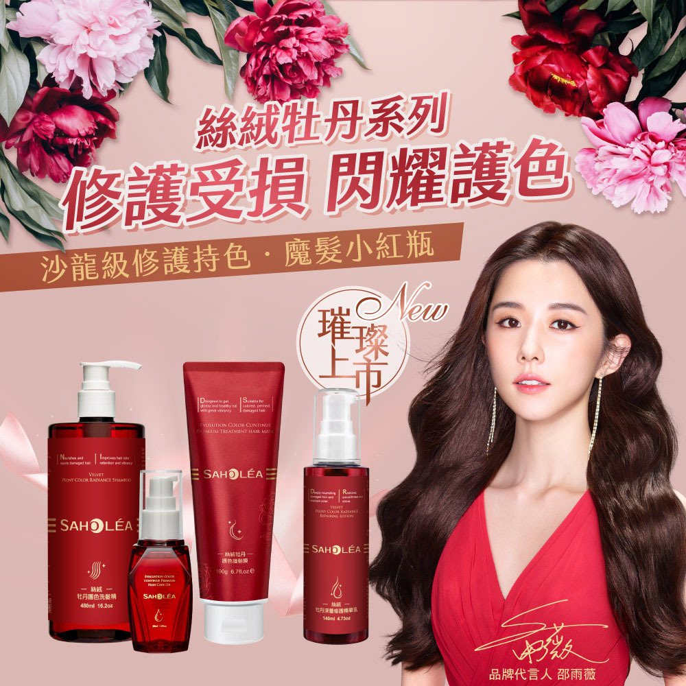 嚴選牡丹根皮萃取、茉莉紫羅蘭花萃精華、保水成分尿囊素,修護乾燥保濕柔順,維持頭髮光澤顯色度
