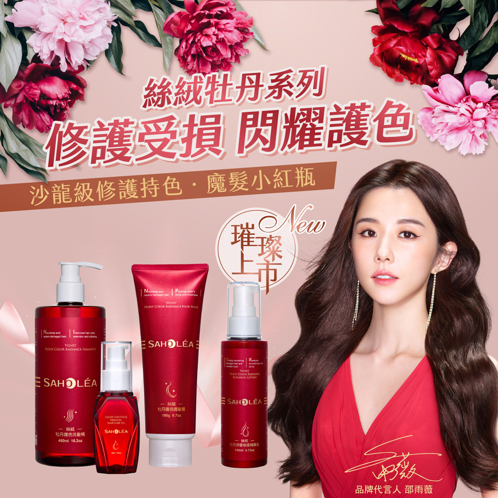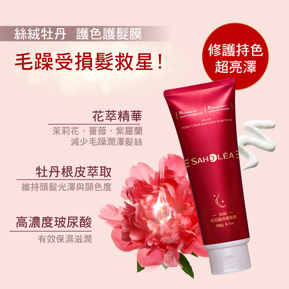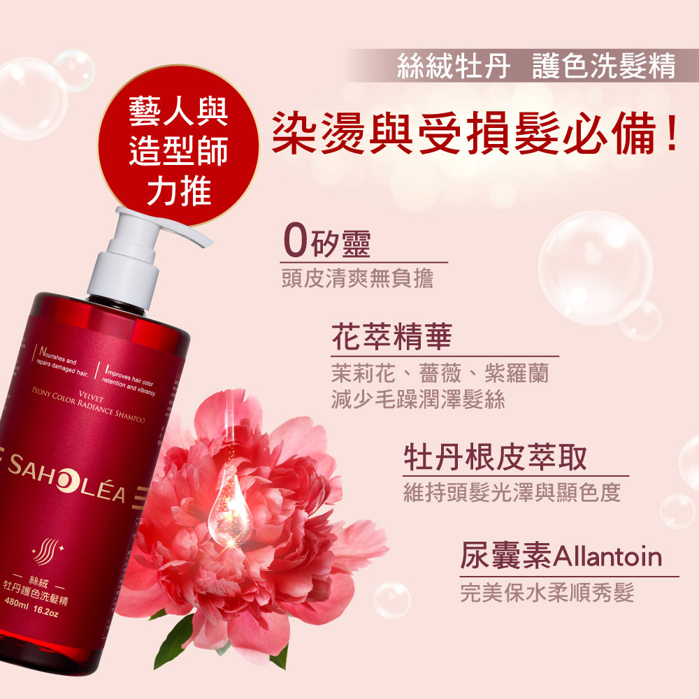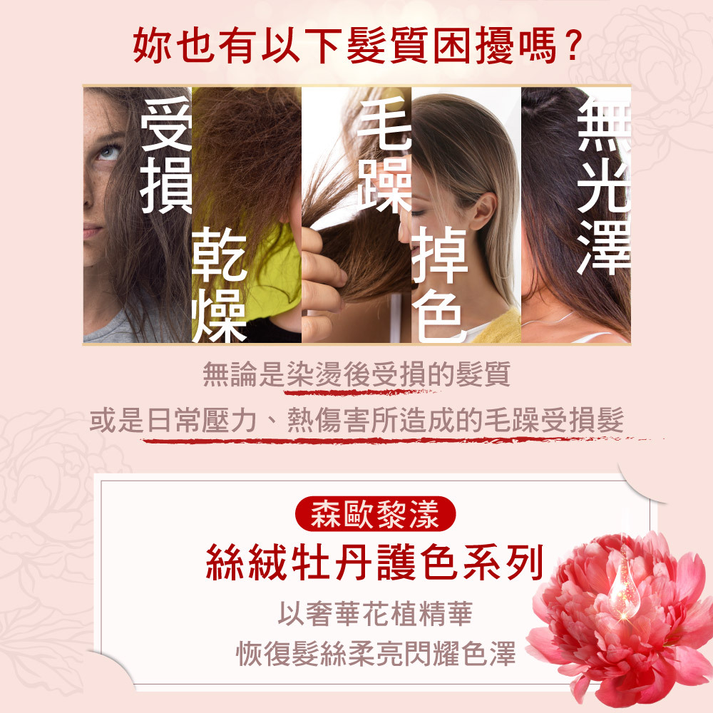 絲絨牡丹護色系列,嚴選牡丹根皮萃取、花萃精華、保水尿囊素,修護乾燥保濕柔順,頭髮光澤顯色