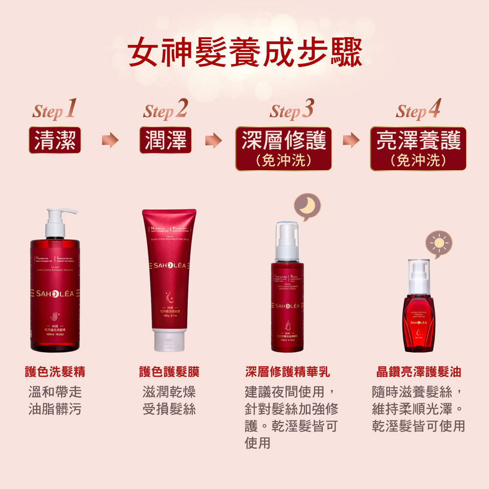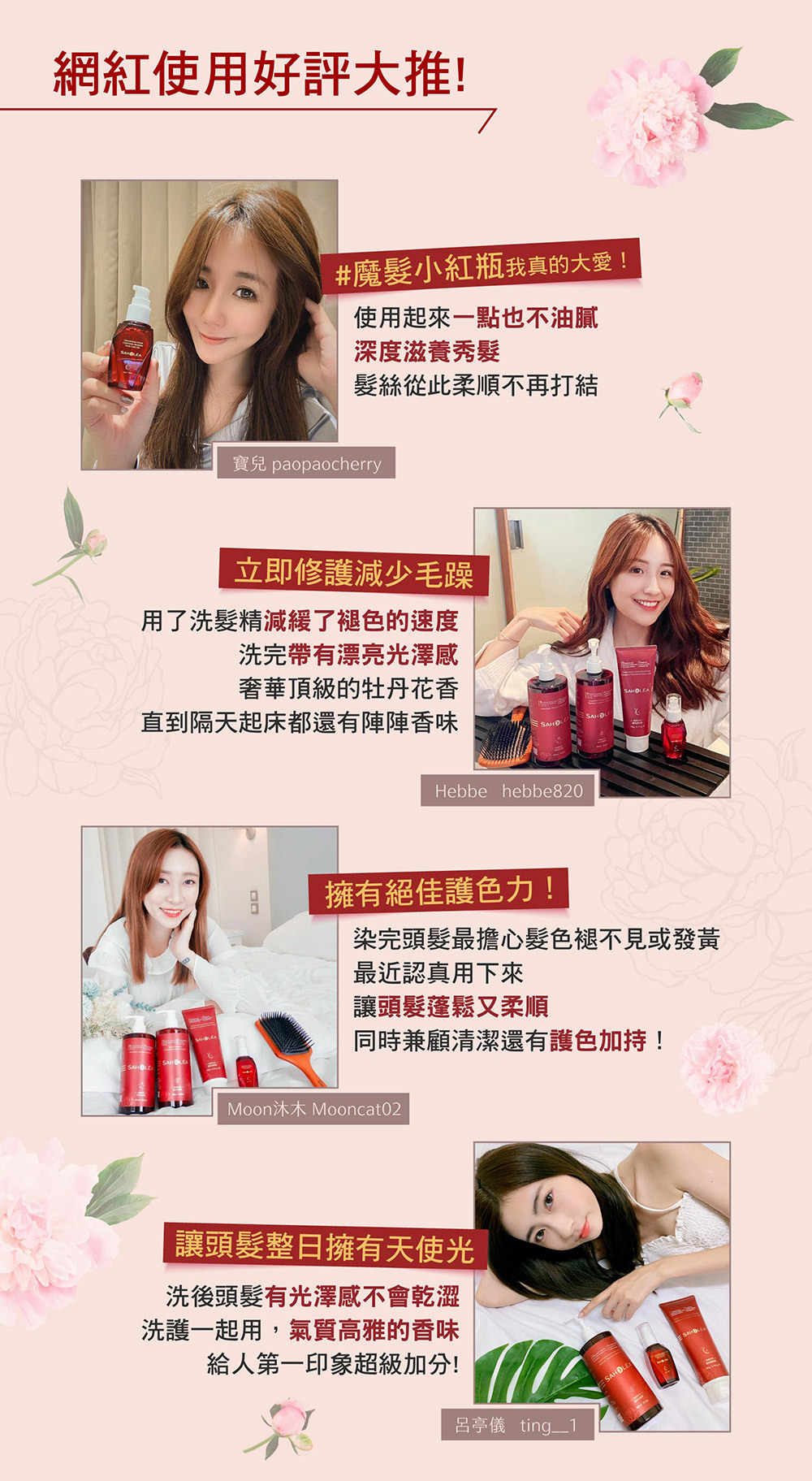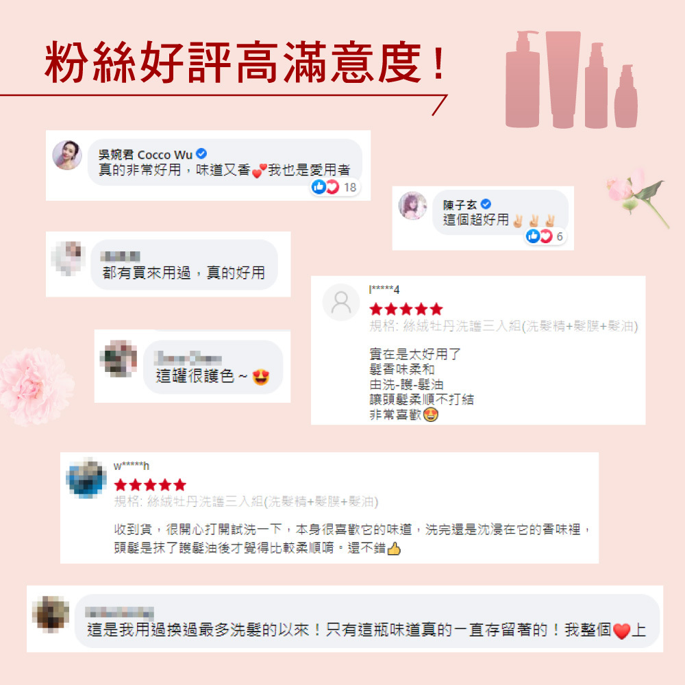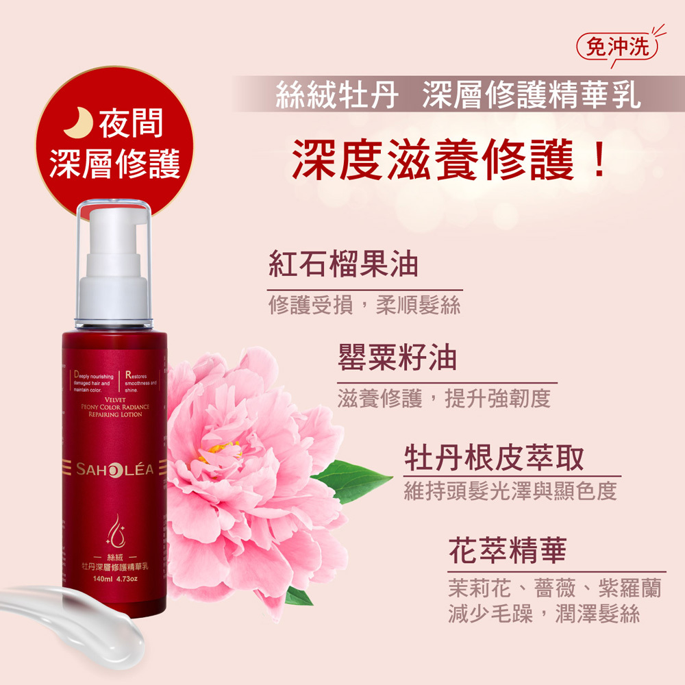 絲絨牡丹護色系列,嚴選牡丹根皮萃取、花萃精華、保水尿囊素,修護乾燥保濕柔順,頭髮光澤顯色